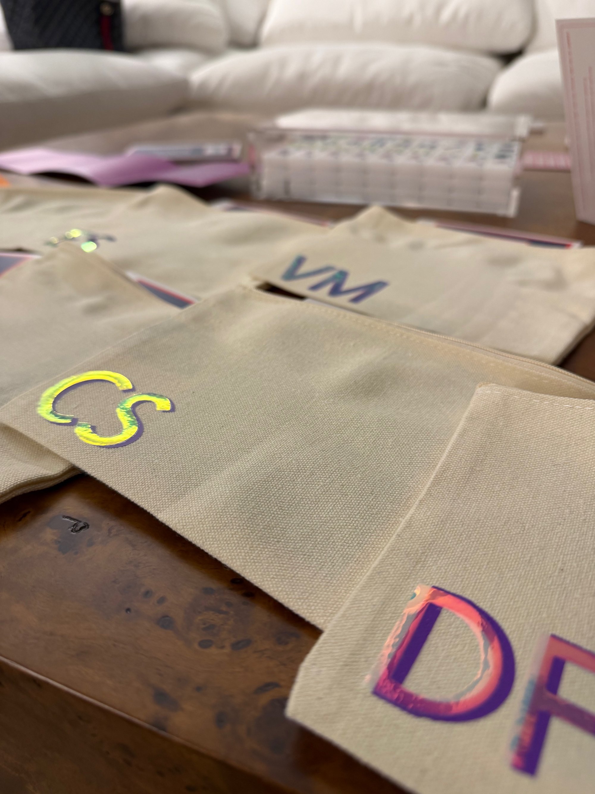 our monogrammed canvas mahjong card holders are the perfect size for your card and any additional small items you need for game night! we can do one, two, or three initials. just specify your colors at checkout, and let us know if you'd like an iridescent overlay (as pictured). these make perfect gifts!